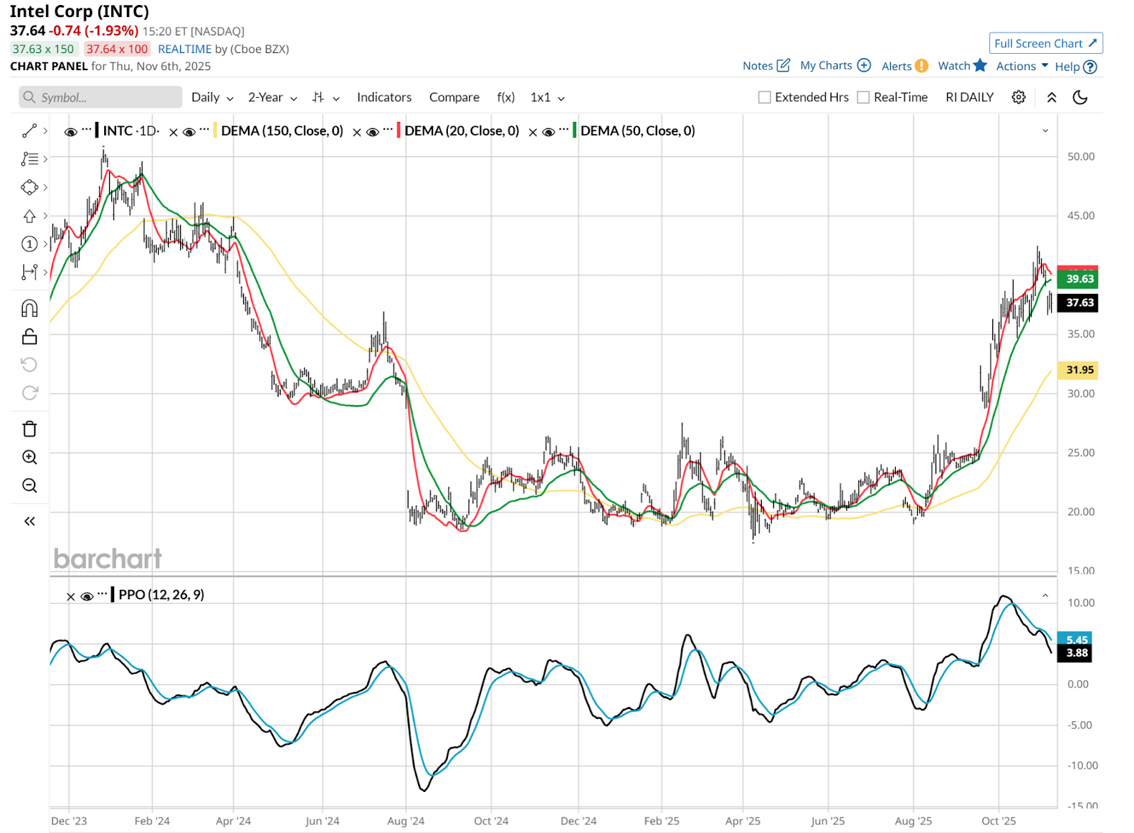 INTC looks like it could really be a hot mess. That should be no surprise after doubling since August. When a micro-cap stock does that, we don’t think twice about it. But this is still a major tech stock.