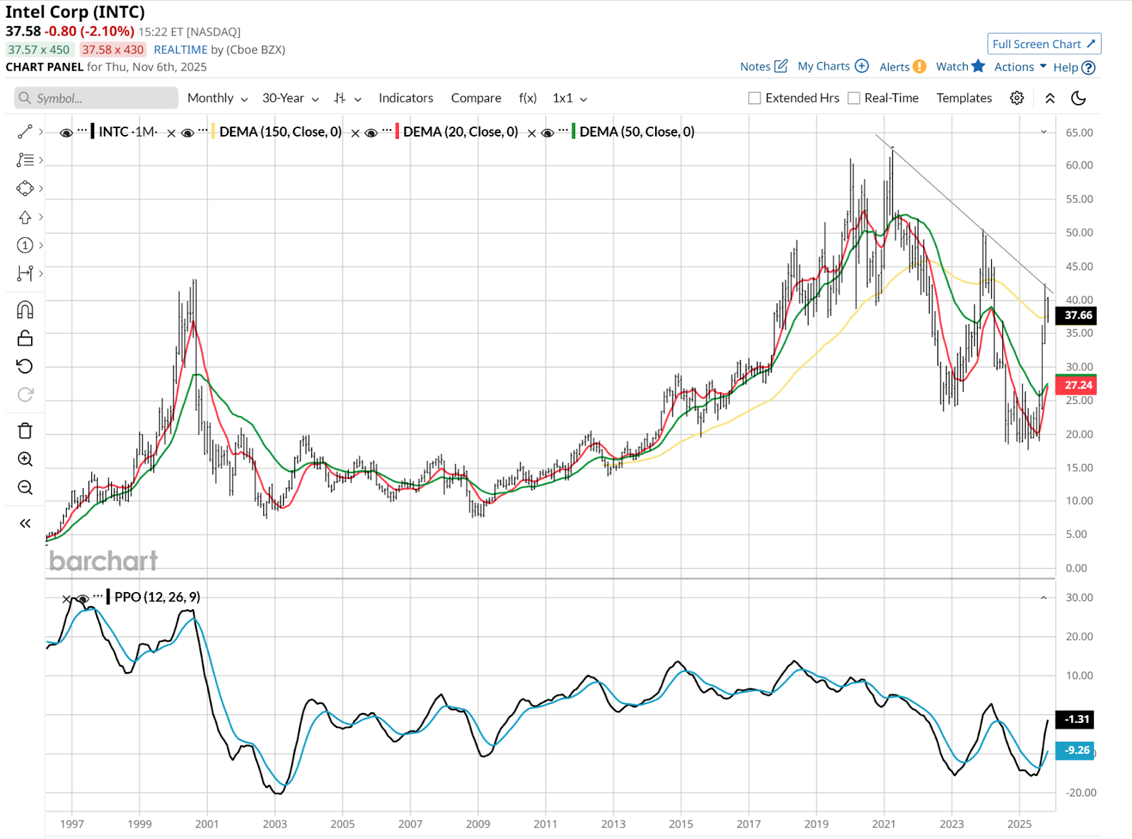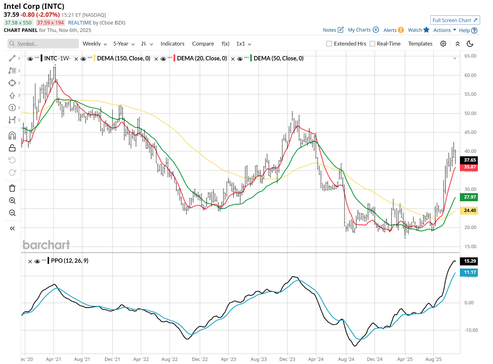 The first is Intel (INTC), which on Sept. 18 announced a $5 billion investment from Nvidia (NVDA). That followed news in August in which the U.S. government made a rare decision to convert previously awarded grants into cold hard equity. That makes Uncle Sam a 10% stakeholder in the now-mature semiconductor stock.